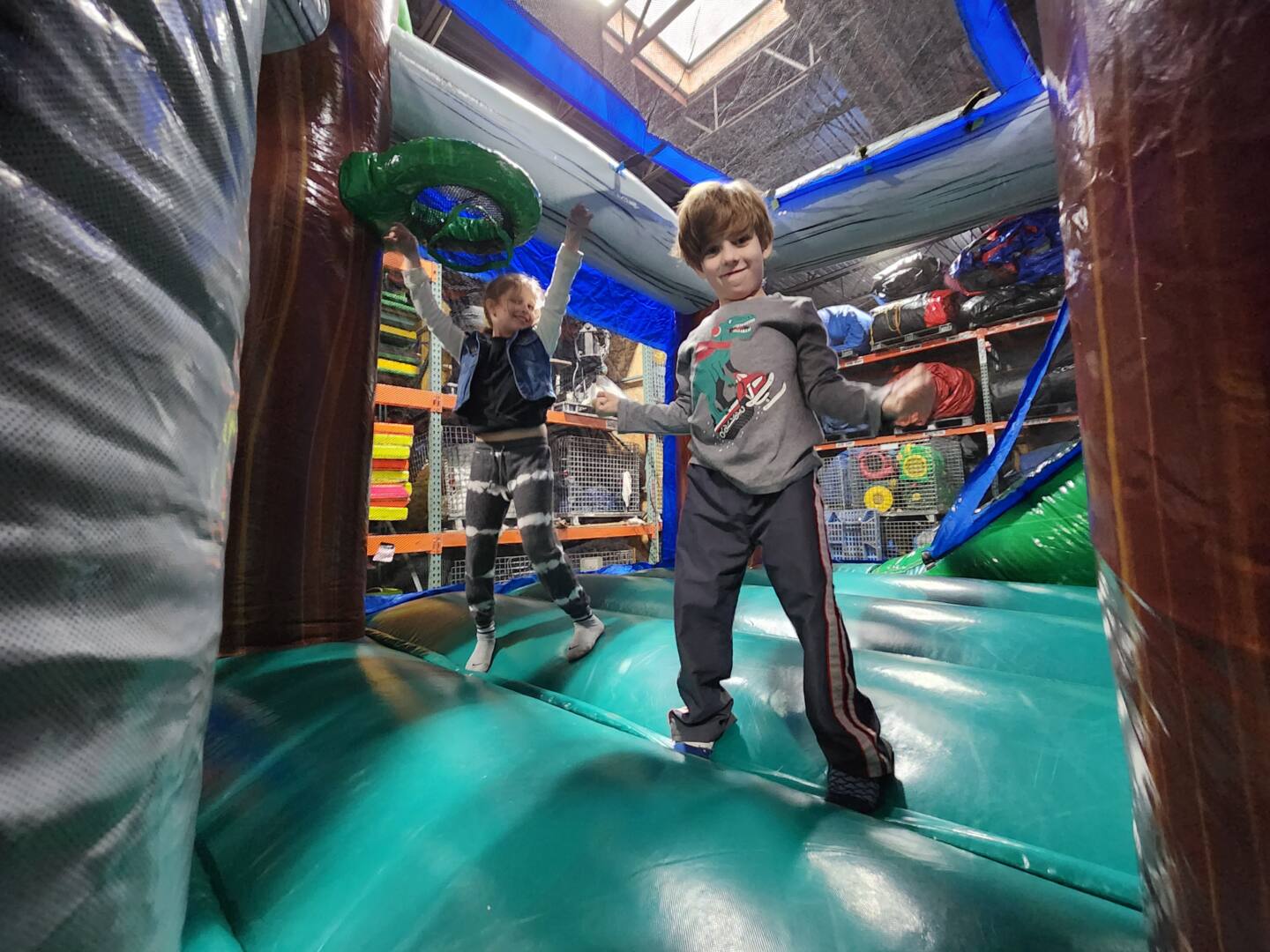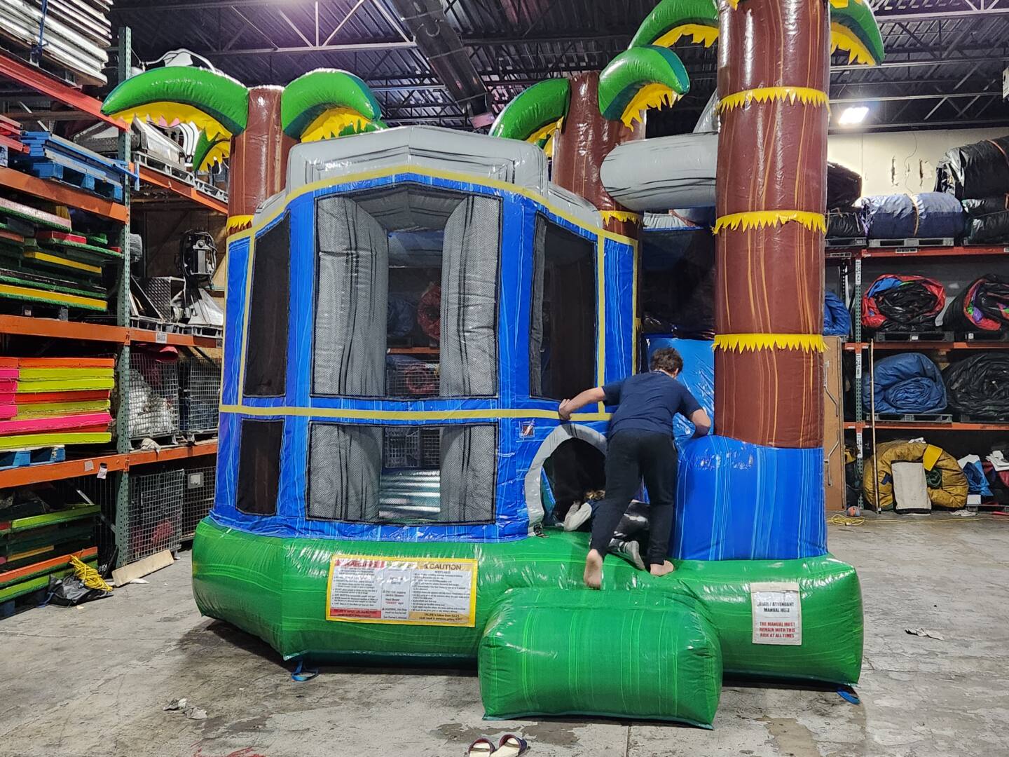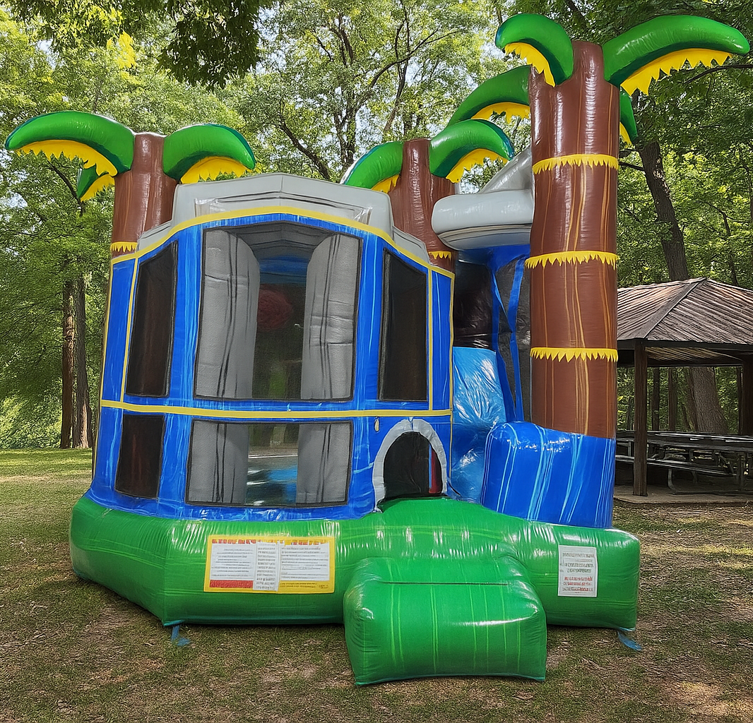 Children will enjoy a series of activities as they move through this colorful, airy, mesh walled castle. They’ll climb over and crawl under a group of air-filled obstacles, pass along the moonbounce section that includes a basketball hoop, climb a hill and finally glide down a slide to the finish. This vivid inflatable has palm trees on a bed of water. The flow of movement is outstanding with a defined entry and exit.