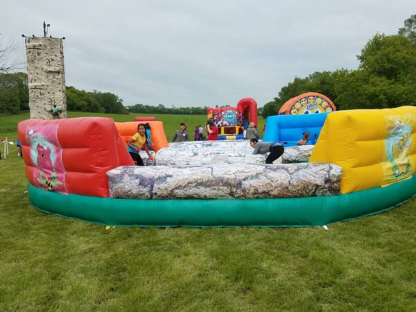 Get ready….get set… time to chow down you hungry hippos! This is the latest 4-player bungee tug-o-war style game that involves speed, strength, and agility. Each of the 4 players starts from their back wall and races to the pond of balls in the center of the game to retrieve as many balls as possible and return them to the mesh bag at their starting wall. Once all of the balls are “chow’d down”, the player with the most balls in their bag is the winner. Yes, this game is just like a giant human version of the classic board game Hungry Hungry Hippos!