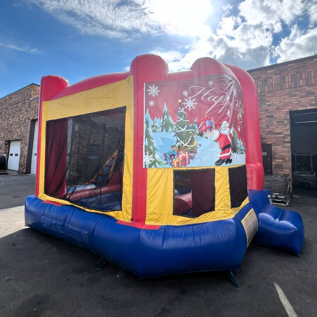 Entertain youngsters with several activities that include: a group of flexible inflated obstacles, a moonbounce and a climbing hill to a slide. The unit features a Holiday themed banner that illustrates a festive scene. Children move easily from the entryway, through different sections and on to the exit to provide an excellent flow of movement for maximum use. Approximately 18’x18’x18’H.