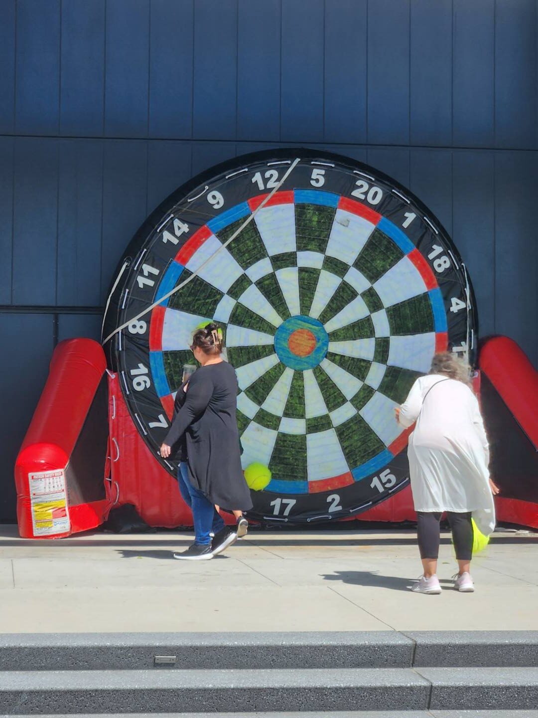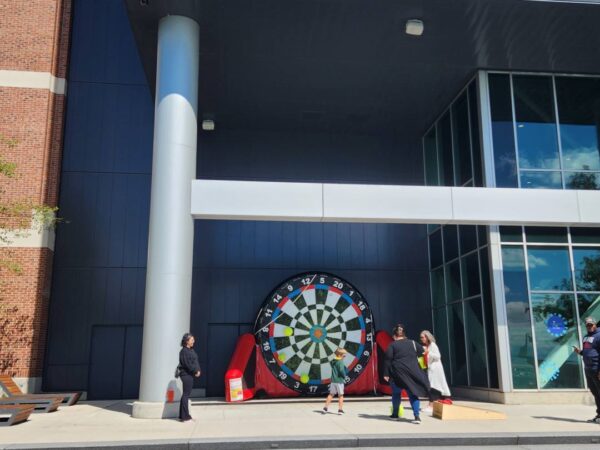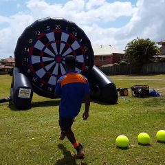 A whole new type of fun with an inflatable Velcro dart game. Exactly the same as traditional darts only much, much bigger and the darts are Velcro! This giant inflatable version of the game stands at just over 10ft wide and 20ft tall! Scoring is exactly the same as the normal game. Although the dart board is much bigger, this is still a tricky game to play! Great fun for kids and adults alike. Ideal for all types of events and can be used indoors or out.