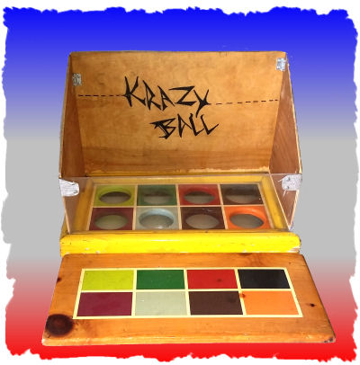 This box shape game has eight ball-catching areas of different colors. A board showing the eight different colors accompanies the playing box. The player selects a color on the board, tosses his ball into the box, and tries to make it land on the color he chose. If it’s a match, he wins.