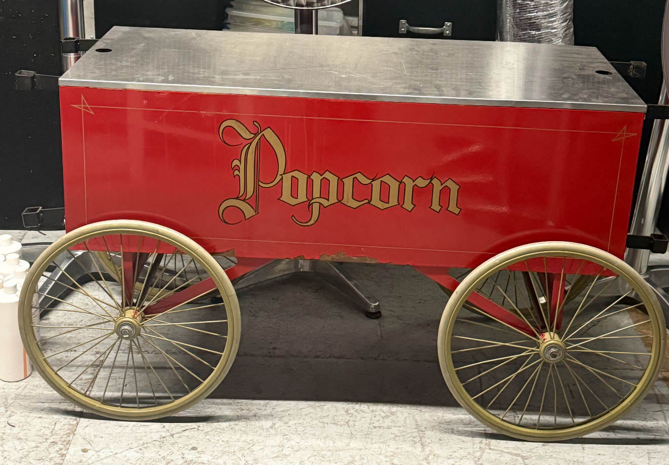 Bring nostalgic charm to any event with this vintage-style Popcorn Cart. Featuring a bold red body with elegant gold “Popcorn” lettering, this cart instantly creates a fun, carnival inspired atmosphere. The cart features large decorative spoke wheels for an eye-catching old-fashioned look. Its stainless steel top provides a durable preparation and serving surface. This is a great way to add a timeless appeal while serving fresh, hot popcorn to your guests.