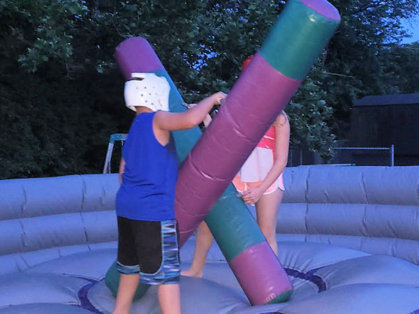 Our Round Gladiator Joust puts a new and exciting spin on the traditional gladiator joust rental. This regal, round gladiator arena in purple and silver has an awesome archway entry with inflated spikes on top. Gladiators battle it out with padded jousting poles to see who the winner is by pushing the challenger off the elevated center to the cushioned pit below. All gladiator equipment included.