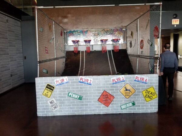 4 player Basketball shootout with a street theme. Surrounded in authentic chain-link fencing, and featuring a backboard designed to look like wood siding covered in graffiti, this urban style carnival/arcade game gets all of your guests hyped up to play!